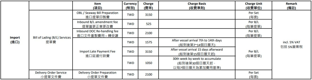 MSC Taiwan Local Charges – Import (incl. 5% vat)